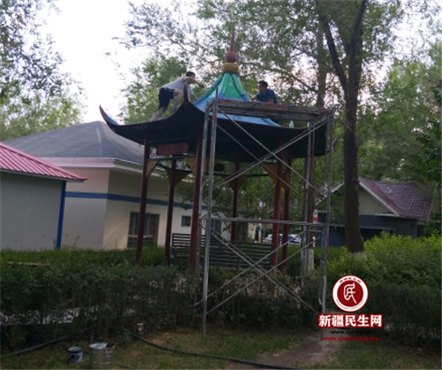 当工作人员提着准备好的油漆、刷子等工具,来到凉亭开始为凉亭改造换新颜时,麻烦也来了,4米高的凉亭顶部这么高,怎么粉刷?这时候住在凉亭周边的居民都纷纷出主意,想对策,搬桌椅搭架子。半个小时后,在广大居民群众帮助下,一个3.5米的架子搭建成功,工作人员站在牢靠的铁架上进行了凉亭顶部粉刷。经过一个上午的粉刷,凉亭大部分上色已完成。中午工作人员就地简单的吃了一些就又开始了下午的工作。为了更好地突显出凉亭的特色,工作人员采取“红、黄、绿”三种颜色的搭配方式,对亭子的粉刷工作进行最后的收尾粉刷。一直延续到晚上九点多,凉亭的粉刷工作全部完成,全体工作人员虽然都很劳累,但是心中却充满了快乐和暖心,因为在一天的粉刷过程中,不停有居民经过,有帮忙递油漆的、送茶水的、送西瓜的,还有竖起大拇指为社区点赞的。