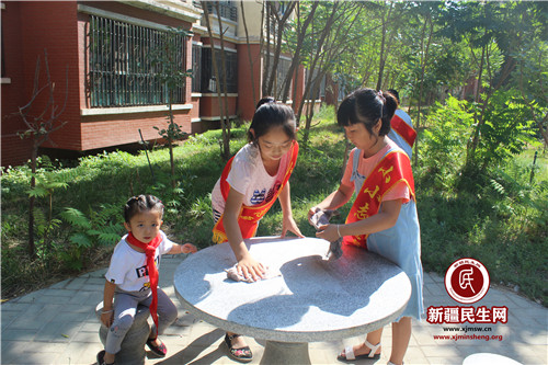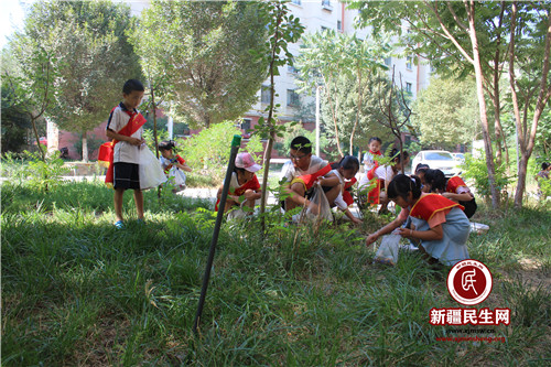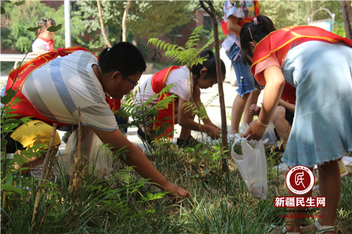 新疆民生网(南淼) 为加强辖区学生管理,丰富暑期社会实践生活,提升学生爱护环境卫生的社会责任感。7月27日,米东区税务局驻米东南路片区管委会同心社区工作队联合同心社区开展“爱护环境卫生,争做环保小能手”欢乐暑期系列活动,组织辖区50余名中小学生清扫社区街道、林带、广场上的杂物。