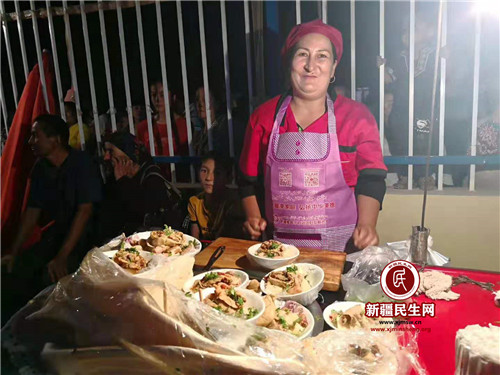 傍晚9点,位于村委会附近的小夜市人头攒动,热闹非凡。贫困户热比娅·赛地早已麻利地摆好了自己的拿手绝活儿:香气扑鼻的牛肉面,皮薄馅多的馄饨和饺子,让人一看就垂涎欲滴的凉皮子。在艾买提的烤肉摊上,一串串烤肉正滋滋冒油。热比古丽也不甘示弱,香喷喷的面肺子、米肠子,清爽可口的凉拌豆子,惹得人们不时驻足停留……20个经营各色美食和小百货的摊位排列整齐有序,迎接着村民们的“检阅”。