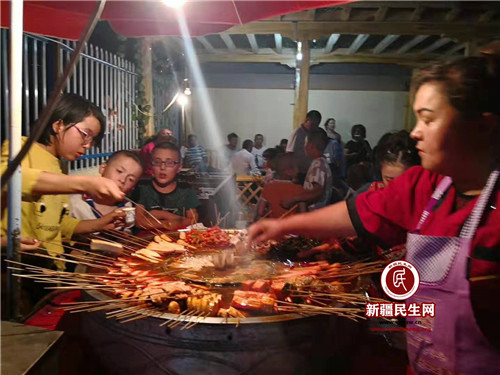 艾扎古丽·热夏提正忙着招呼摊前的顾客,她的摊位专卖麻辣串,一堆孩子正围在摊前大快朵颐。“以前我没有固定的经营场地,路边摆摊到处打游击;现在有了夜市,我再也不用天天发愁晚上要去哪里摆摊了,心里一下踏实了!来夜市的村民这么多,我的收入也比以前高了,真是感谢党的好政策,感谢工作队为我们村民办实事!”