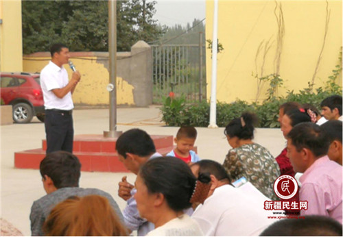 新疆民生网(古再努尔·艾海提)2019年7月29日,阿克陶镇诺库其艾日克村加大健康扶贫政策宣传力度,利用升国旗之机对全村村民进行了健康扶贫政策宣传。