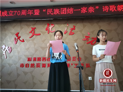 新疆民生网(赵棋)为迎接中华人民共和国成立70周年,传承和弘扬中华优秀传统文化,引导返乡学生弘扬新风正气,传递社会正能量。2019年7月23日,市自然资源局驻湖州路西社区“访惠聚”工作队邀请辖区结亲居民、组织返乡大学生和暑期中小学生举办了一场庆祝祖国成立70周年华诞暨“民族团结一家亲”诗歌朗诵会。