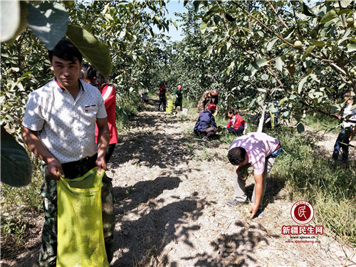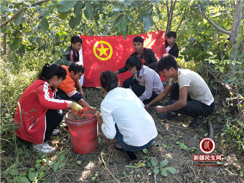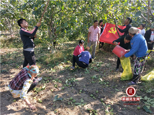 工作队和“村两委”立即组织了一支由村干部、党员、团员为主的共20余人 “志愿服务队”,帮助困难村民吐尼沙汗·依买尔采收核桃。为了尽快完成核桃采摘,志愿服务队先采用机械,剩余由人工完成。一时间核桃地里热闹起来,这个小组打核桃,那个小组就开始捡核桃,还有在装袋、装车……一个个忙得不亦乐乎。劳动间隙,志愿服务队员与村民一起席地而坐,促膝拉家常,访民情,让大家切身感受到了党和政府的关怀和温暖。在志愿服务队的帮助下,顺利的将6亩核桃采摘完成。